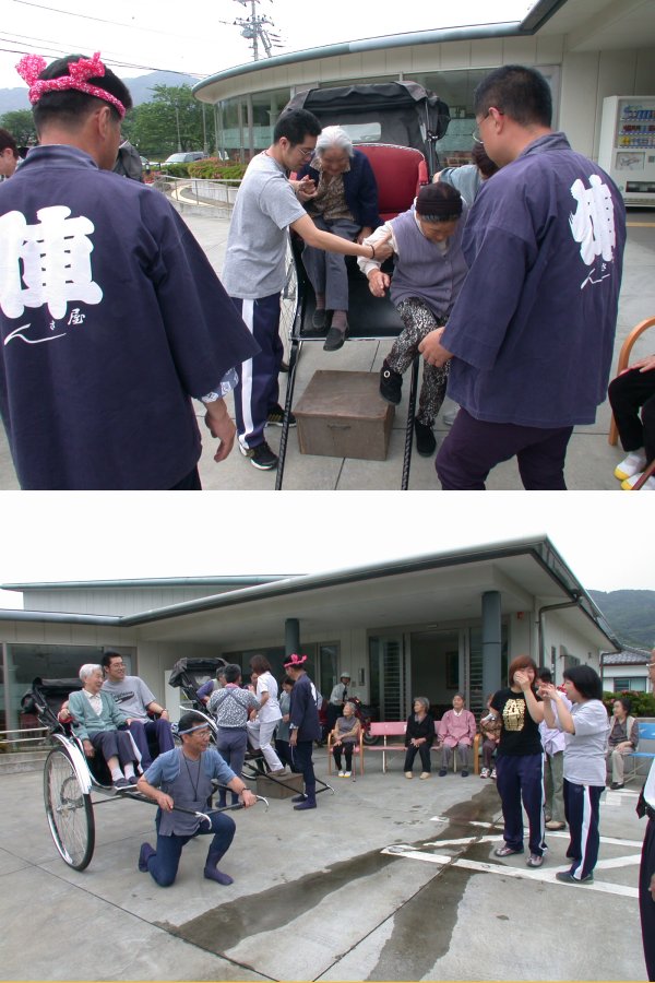 - 長八美術館前で、週末・祝祭日に松崎町内を案内している人力車伊豆松崎組が、結成10周年を迎えました。 10周年を記念し、町内にあるデイサービスセンターを訪問しました。 当日入居者は、人力車の訪問に終始笑顔でした。