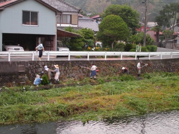 - 松崎町岩科地区では、住民の協力の下、早朝から河川草刈りが行われました。