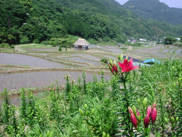 - 棚田では、先週植えた苗が順調に生長しています。 スカシユリなども咲き始めました。
