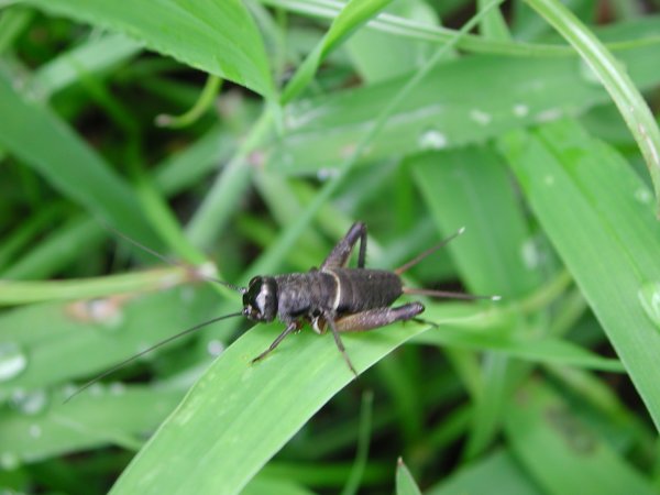 - 道ばたの草むらをのぞくと、コオロギを見つけました。