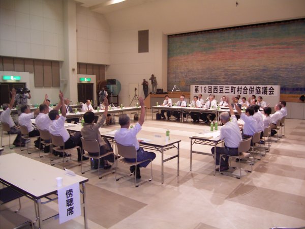 - 8月7日(土)午後1時30分から松崎町環境センター文化ホールで、第19回西豆三町村合併協議会が開催されました。 協議会の冒頭で西伊豆町と賀茂村の委員から、「松崎町で住民投票の実施が決まり、その結果が不透明な現状では、解散も含めて検討する時期ではないか。」との提