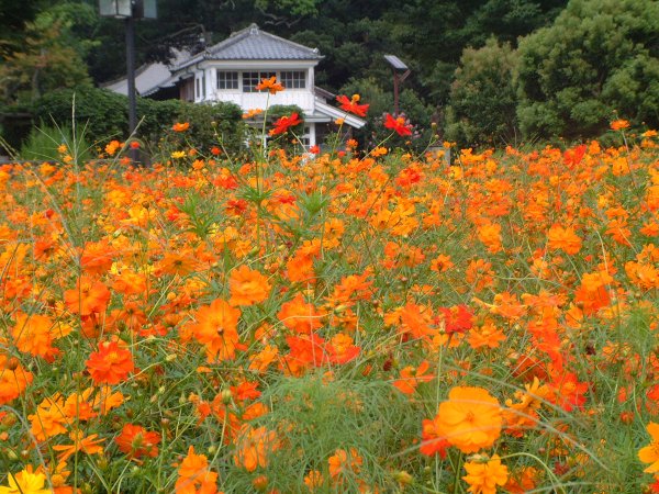 - 岩科川沿いの河川敷には、キバナコスモスがきれいに咲いています。