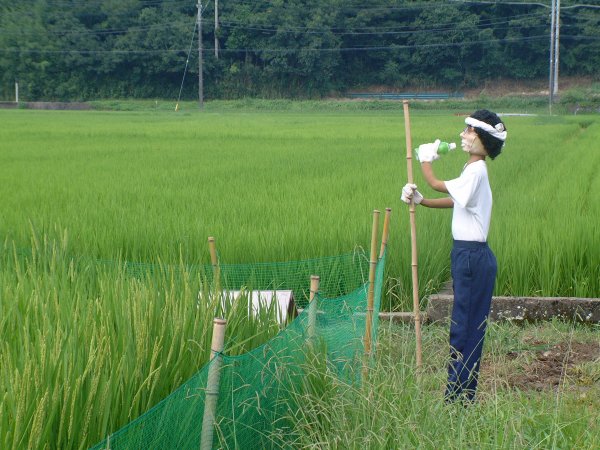 - 春には大規模花畑でにぎわった田んぼも、はやい所では稲穂が実り始めています。 早いところでは、かかしも設置されています。人に見間違うほどのリアルなかかしです。
