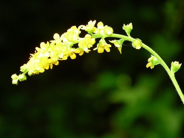 - 里山の道端に、長くのびた茎の上部にキンミズヒキの黄色い花が咲いています。