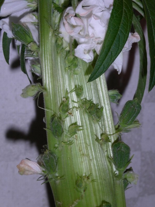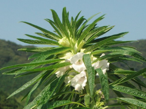 - 珍しい形のものが有りました。 ゴマの花です。茎は普通丸い形ですが、これは両端から押されて平べったくなっています。 暑さをしのぐため表面積を広げたのでしょうか・・・