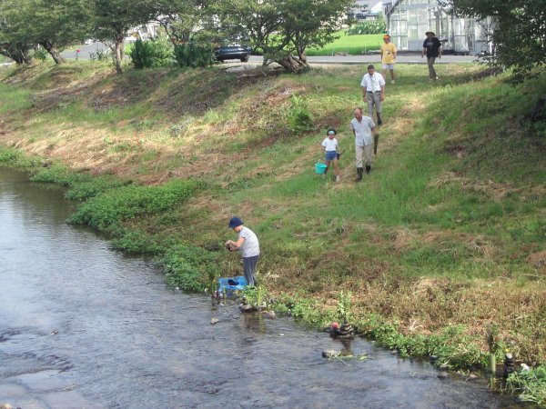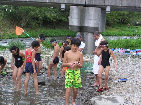 - 花の三聖苑横の那賀川で、沼津スポーツセンター児童が鮎のつかみどりに挑戦しました。