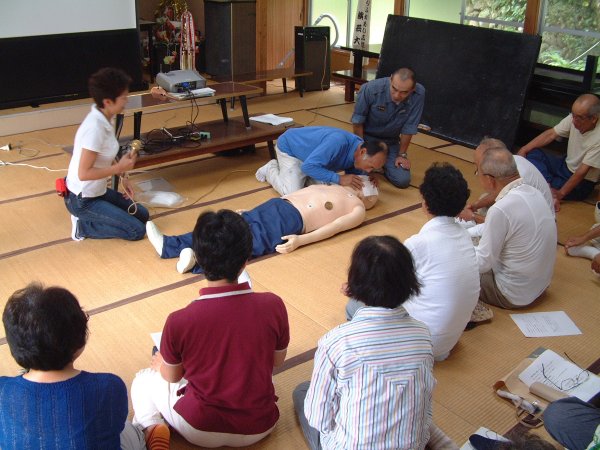 - 防災訓練の様子です。 写真は、峰輪地区人工呼吸訓練。