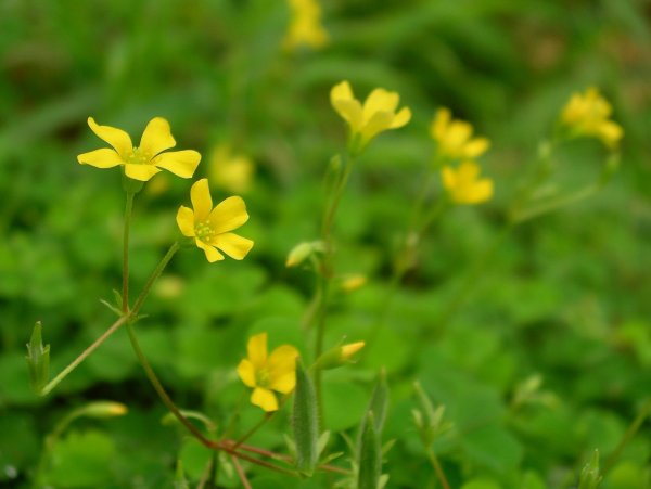 - 畑の脇でロケットのような形の実を付けたカタバミがきれいに咲いています。