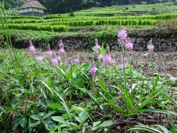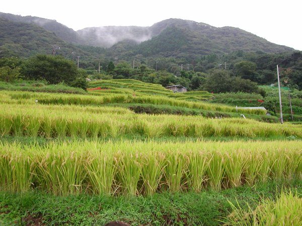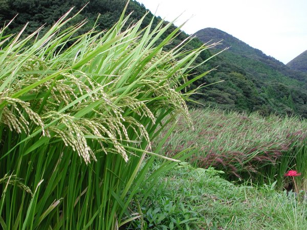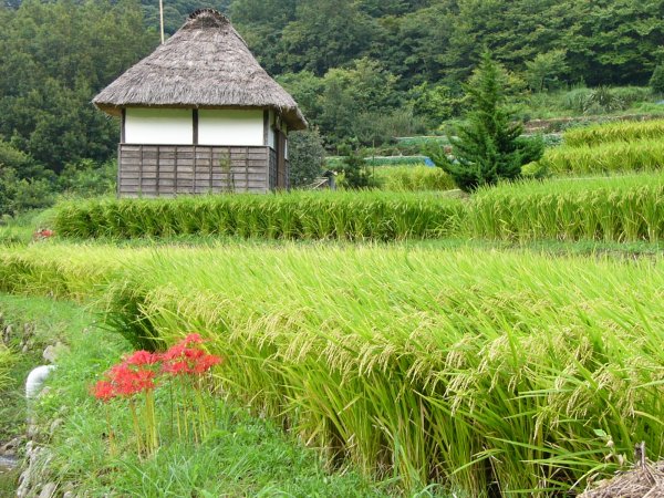 - 棚田では、稲穂もだいぶ実り、アゼにはヒガンバナなどの野草が咲きすてきな風景が見られます。