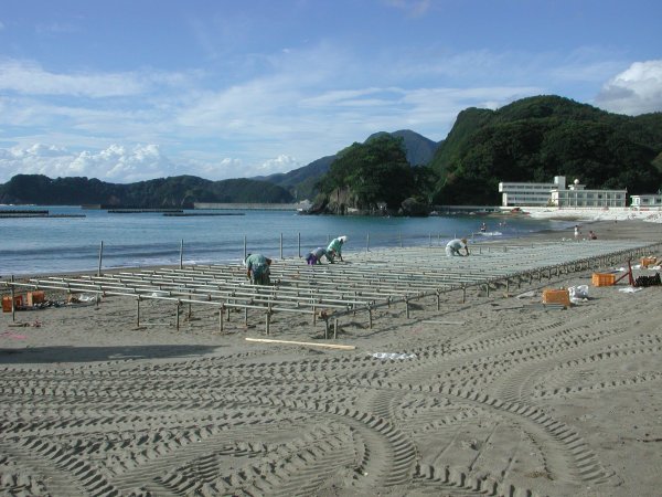 - 松崎海岸では、平成16年9月11日(土)午後6時から開催される「第5回伊豆半島太鼓フェスティバル」会場準備が始まりました。