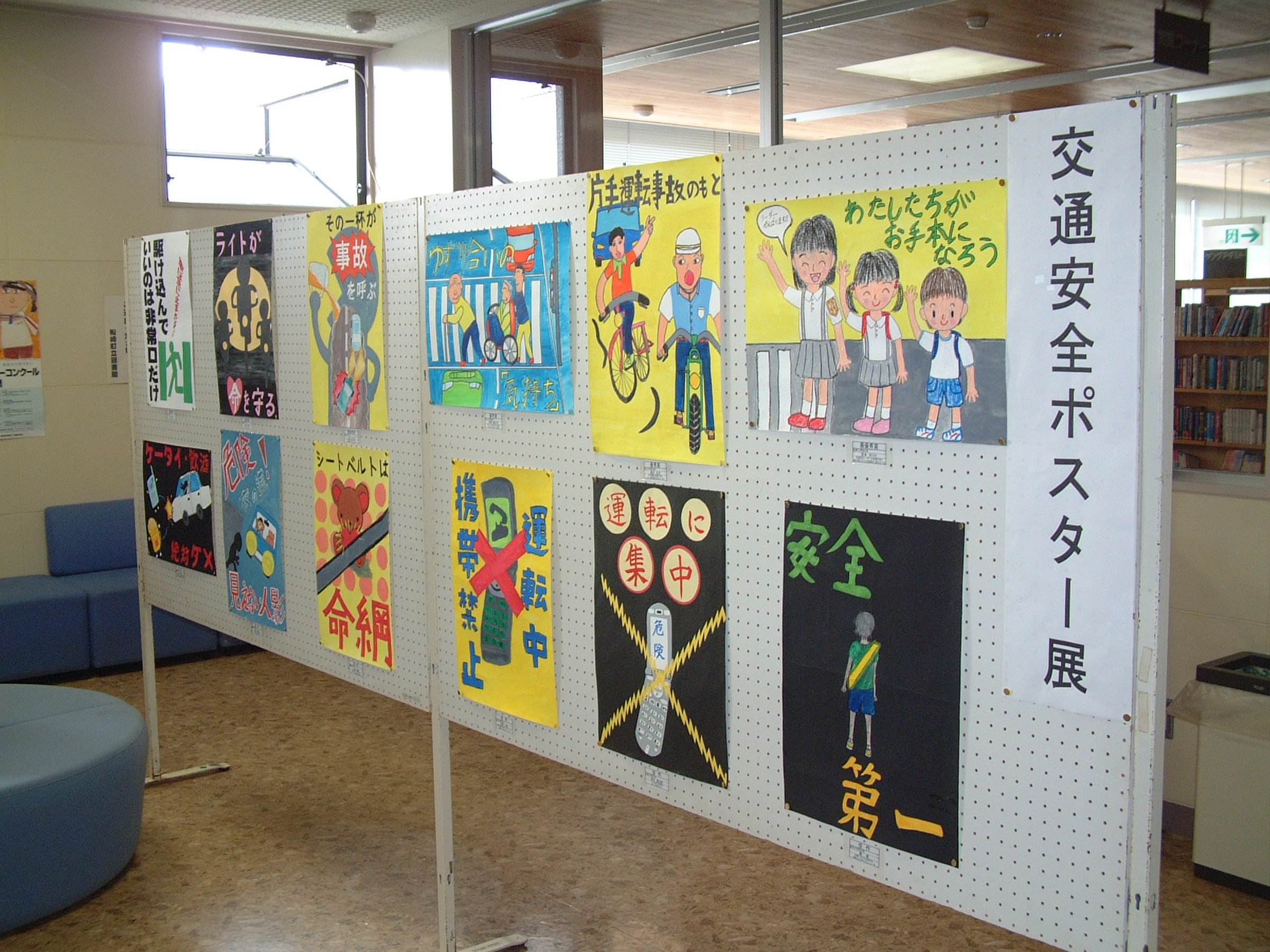 - 夏休み中に描かれた小中学生の交通安全ポスターの入選作品を図書館横ロビーに9月末まで展示しています。