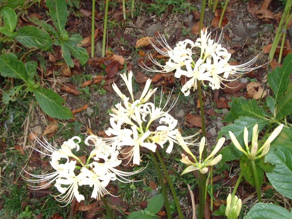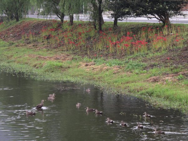 - 那賀川宮の前橋下の土手では、赤い彼岸花の中に白色のもの咲いています。