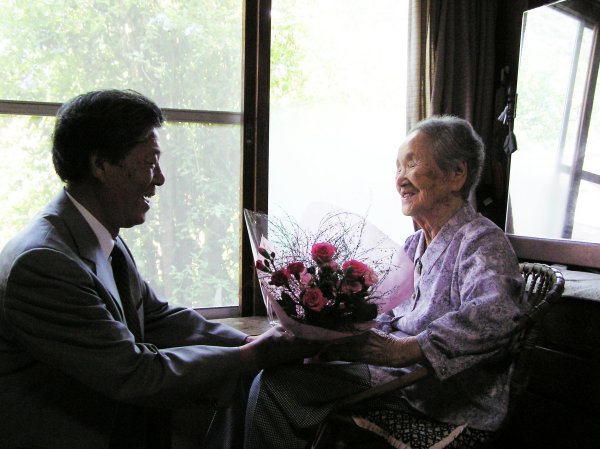 - 白寿(99歳)のお祝い。町長が記念品と花束を持って高木ちよさん・真野まさ子さんを訪問しました。