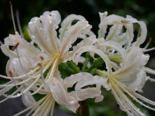 - 道ばたに白いヒガンバナを見つけました。 雨で滴がつき、綺麗でした。