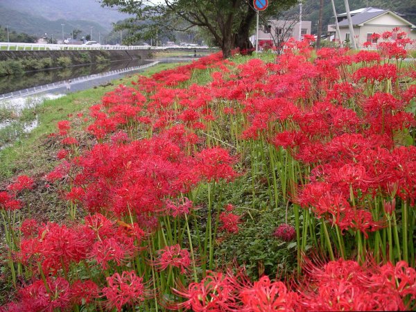 - 岩科川の土手に、たくさんの彼岸花が咲き競い田舎の美しい自然風景を演出し、地域住民の心に潤いを与えています。