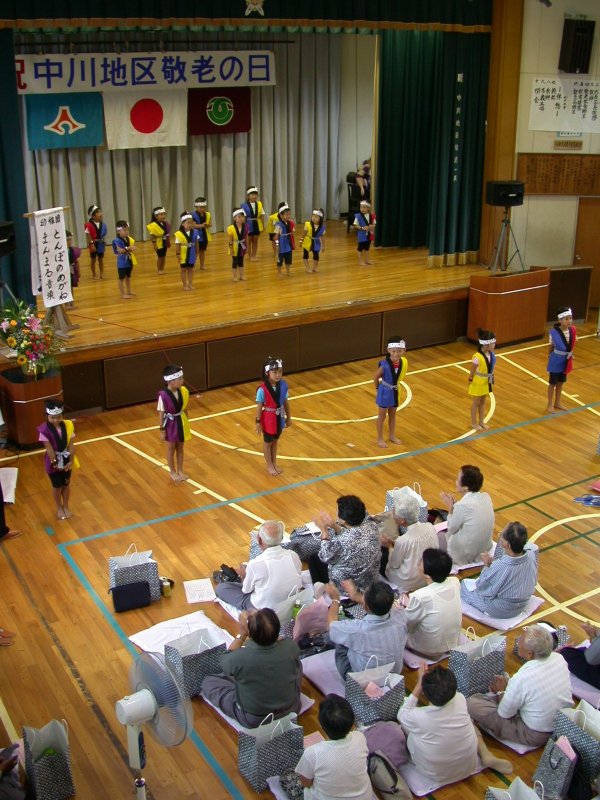 - 中川小学校体育館では、那賀川地区の敬老会が開催されました。 演芸の部では、中川幼稚園園児の踊りを始め様々な催しに拍手が絶えませんでした。
