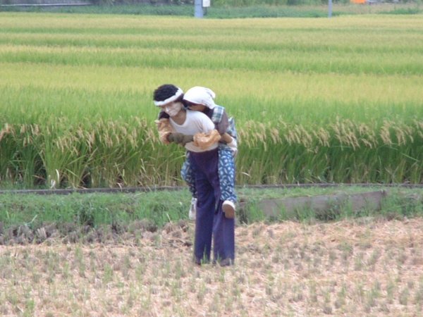 - 町内でも稲刈りするところが多く目につきはじめました。刈った後にも遠くから見ると、目を疑いたくなるようなかかしが立っています。