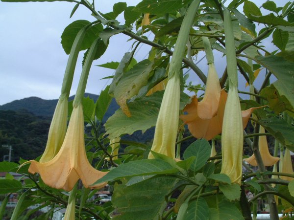 - 「世界の中心で、愛をさけぶ」でもよくでた山口の木橋脇には、エンゼルストランペットが咲きはじめました。