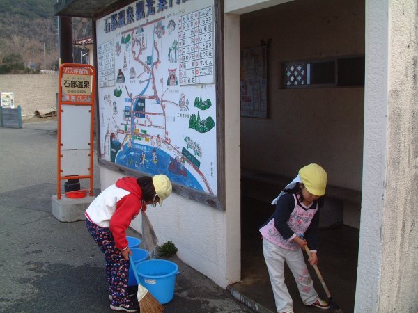 - 三浦幼稚園では毎月、近くの石部バス停を清掃しています。来月から小学生になる年長園児は手をかりず自分達だけで最後の清掃をしました。