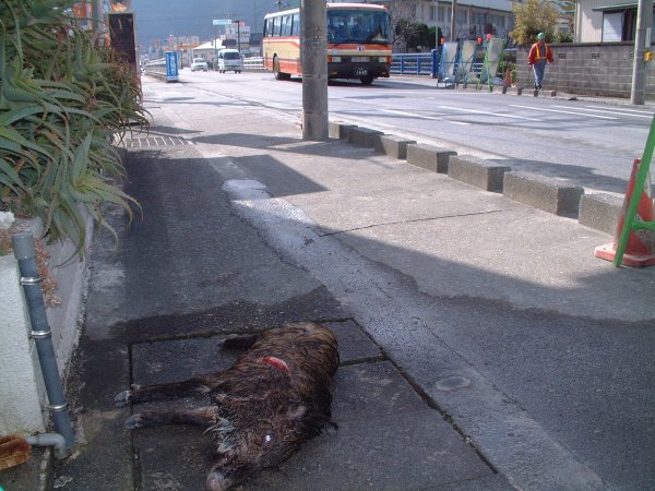 - 今朝、江奈地区にいのししが下りてきました。さいわい、周辺住民の方にケガ人もなくすみました。