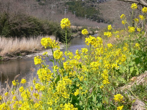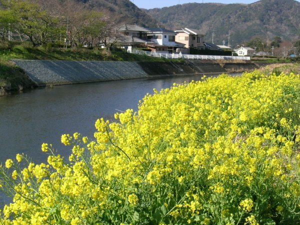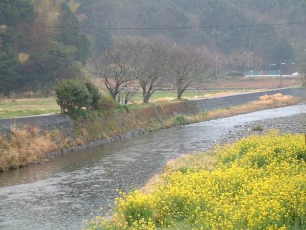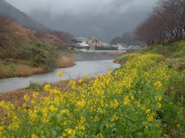 - 今日は一時雨が強くふる時もありました。岩科川の菜の花が見頃となっています。