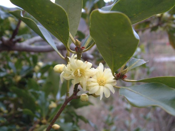 - 仏前に供えられる木のシキミに花が咲き始めました。