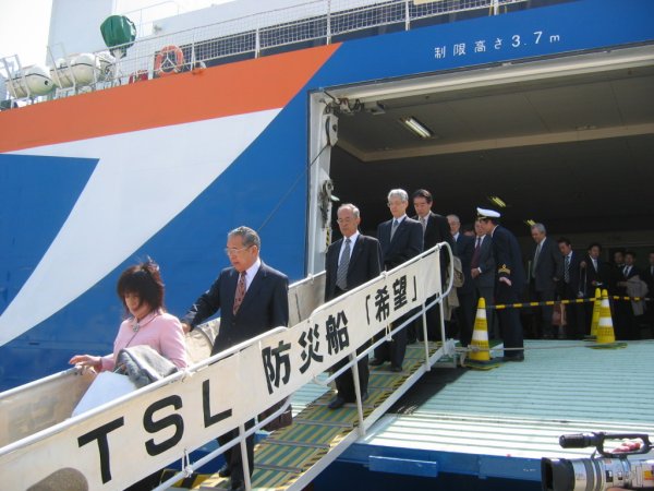 - 降船される、森県議、西原県議ら来賓の皆様と県防災局長ら関係者の皆様を歓迎しました。