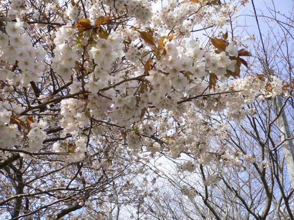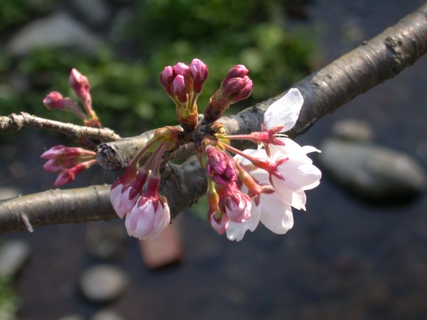 - 川に沿って歩いていると、まだまだつぼみの桜から今が盛りの桜、葉桜までいろいろな表情の桜が楽しめます。