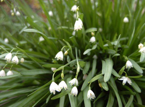 - 町内のあちこちにスズランスイセンを見かけるようになりました。 すっと延びた緑の茎から、お椀を伏せたような白い花が頭を垂れています。