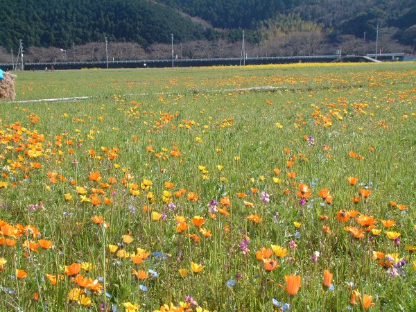 - 那賀大規模花畑は、少しづつ花が目立つようになりました。 花は、県道下田松崎線と平行して花畑を走る農道沿いに多く咲いています。