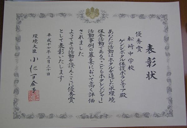 - 松崎中学校生37名で構成する「こどもホタレンジャー」が、ホタルを通じた水環境保全活動を評価され、環境大臣より優秀賞を受賞しました。
