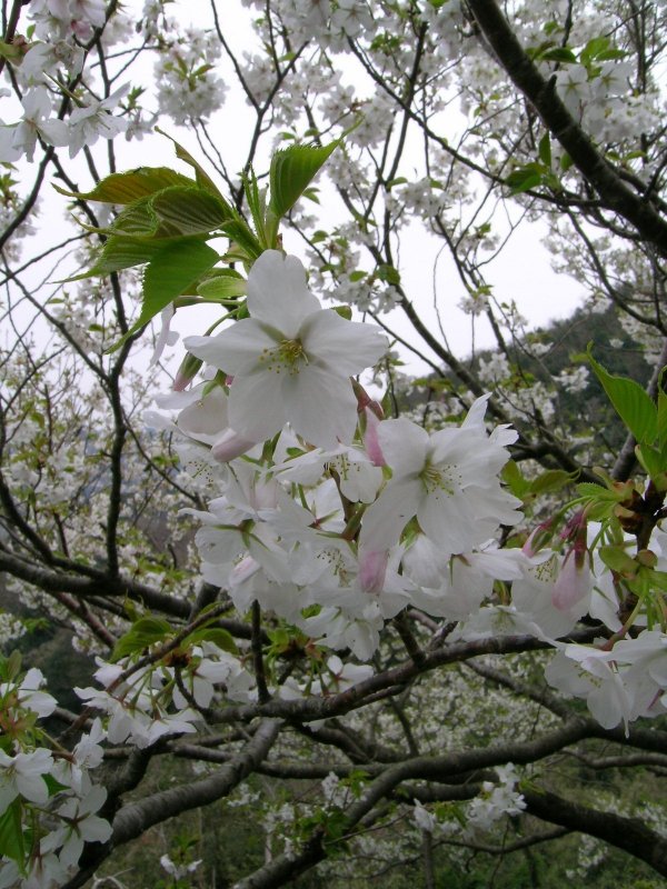 - 高通山山頂一帯に広がる山桜がやっと開花しました。満開になると山の山頂付近が白く見えます。