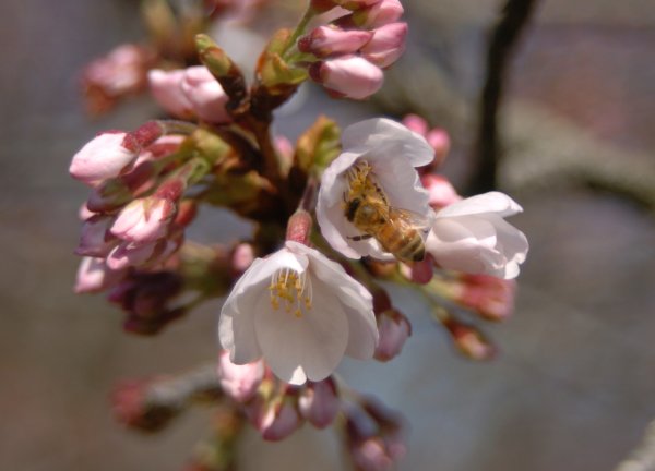 - 桜の花にはミツバチがとまり、密を集めています。 今日も穏やかな日和なので、花が開くことを期待します。