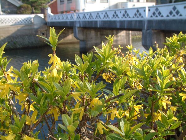 - ときわ橋のたもとに、レンギョウの花が咲き始めました。