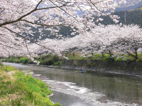 - 桜の花びらが川を覆っています。那賀川でカヌーを体験する方達がいました。