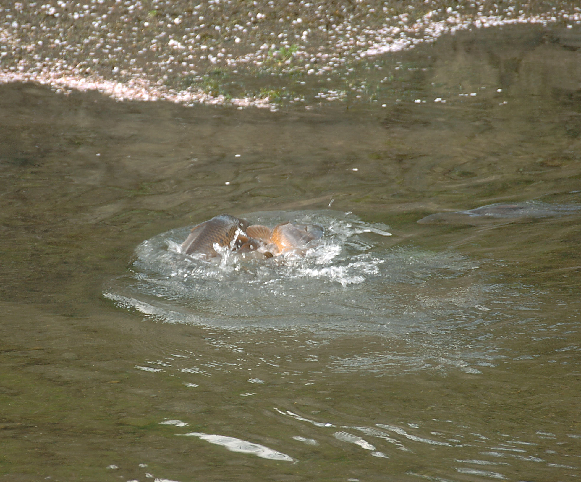 - 那賀川桜並木の下では、コイが浅瀬で暴れています。 産卵シーズンなのでしょうか。