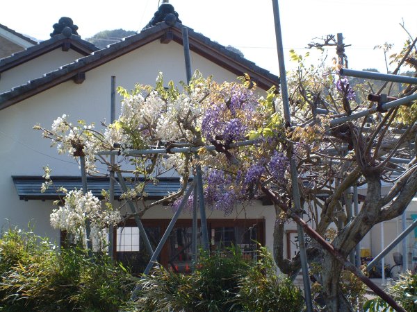 - 重文岩科学校前のフジが白や紫の花をつけはじめました。観光客の方も足を止め見物されていました。