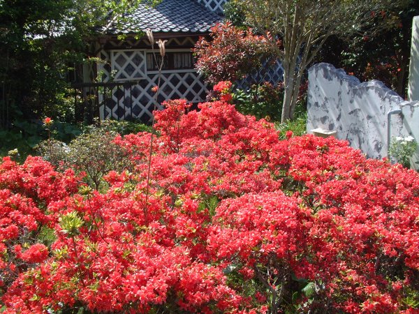 - 伊豆文邸隣のポケットパークのキリシマツツジが真っ赤な花をつけ見頃となってます。