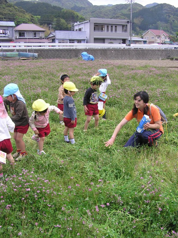 - 幼稚園児がレンゲ畑で花を摘んだり、鬼ごっこをしたりして楽しそうに遊んでいました。