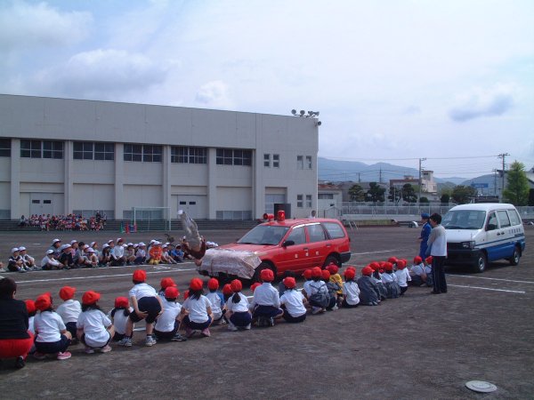 - 松崎小学校で交通安全教室が行なわれ、大型車の内輪差、ダミー人形を使っての衝突の激しさなどを学びました。