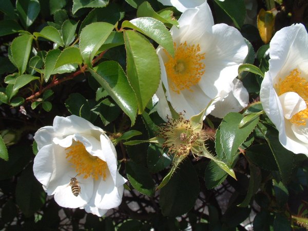 - 夏椿が咲いています。花にはミツバチが蜜を吸おうとたくさんいました。