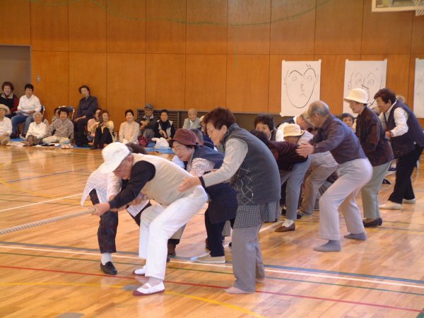 - 勤労者体育館では、さんさん松崎老人スポーツ大会が開催され、白熱した会場では綱引きなどの競技が行われました。