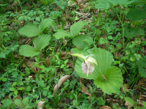 - 「クマガイソウ」(熊谷草)が咲いていました。 全国の低〜亜高山帯までの樹林下に生える大型の地生ランです。茎は高さ40cm程で、4-5月に2枚葉の中央から大きな袋状の花を咲かせます.年中を通して直射日光の当たらないうっそうとした針葉樹林下や竹林などに自生します.袋