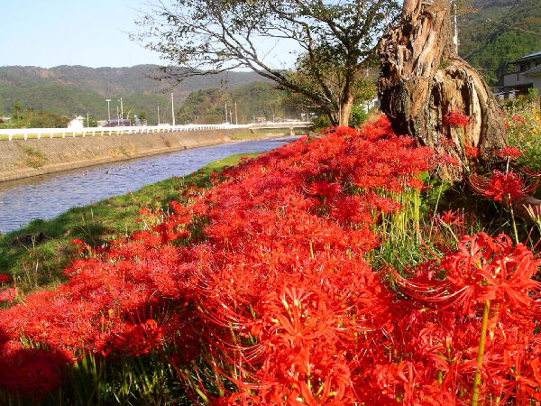 - 今日は、やや風の強い秋の1日でした。 岩科川の堤沿いには、彼岸花があざやかに咲いて地域を彩っています。