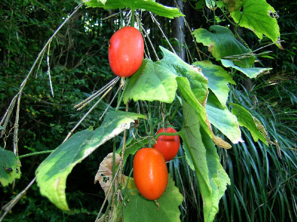 - 赤く色づいたカラスウリが見られるようになりました。 今日は風が吹いて暑い1日でしたが、もう秋なのですね。