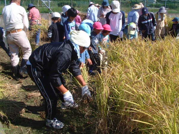 - 岩科小児童で耕作している田の稲刈りが行われました。幼稚園児も慣れない鎌を使い、一緒に稲刈りを手伝いました。