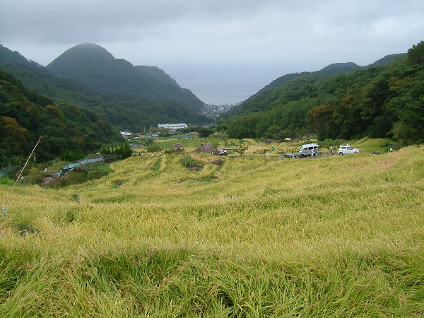 - 今日の石部棚田です。 棚田では黒米の刈り取りが行なわれていました。