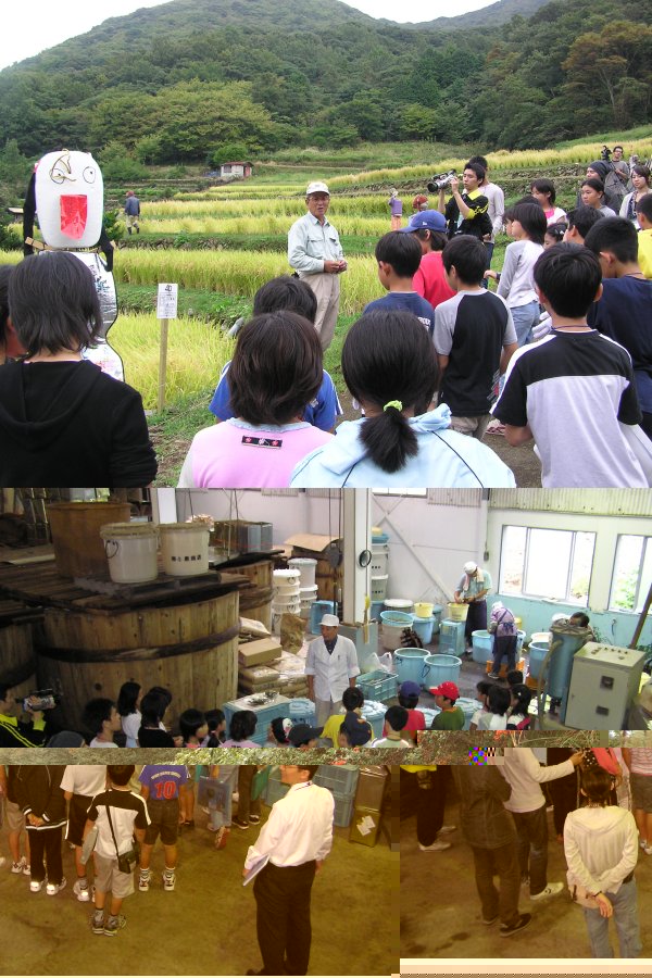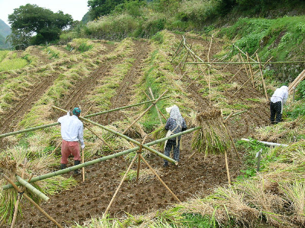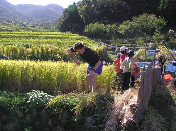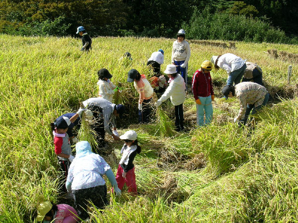 - 石部棚田にある三浦小学校の田の稲刈りを行いました。外国人教師の方も稲刈りを体験しました。