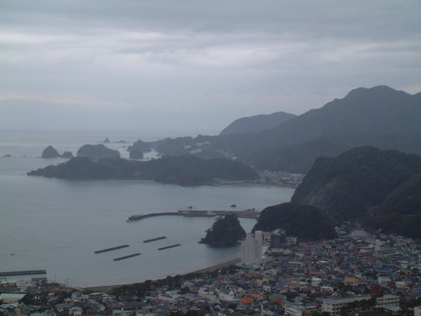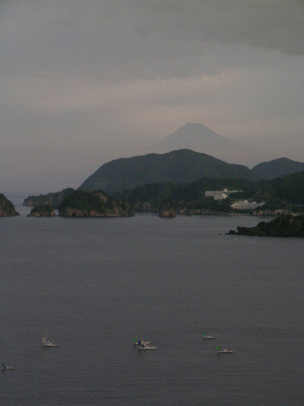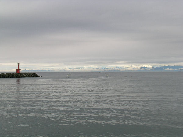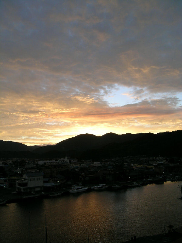- 今日は、あいにくの天候で、対岸の山々も雲に覆われていました。 写真は、おなじみの松崎港からの風景です。