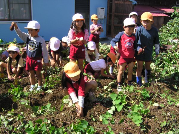- 松崎幼稚園で栽培するさつまいも畑の収穫時期となりました。土の中のさつまいもを見つけては、楽しそうに収穫していました。